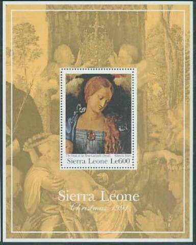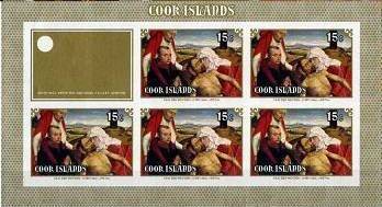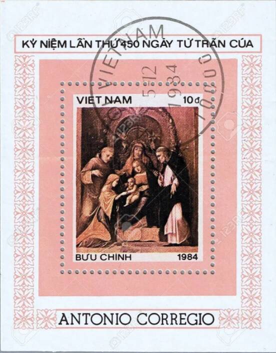 We vestigen uw aandacht op het feit dat we deze schilderij terugvinden op postzegels van Lesotho en Vaticaan maar dat bij laatstgenoemd een nimbus (stralenkrans) werd toegevoegd.