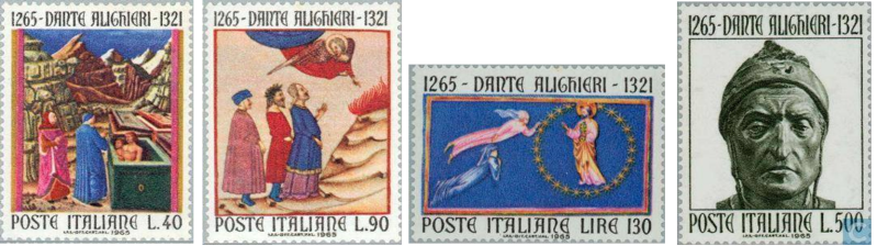1965 – Italië - Uitgifte ter gelegenheid van de 700ste verjaardag van de geboorte van Dante Alighieri met de drie delen uit zijn werk “La Divina Commedia” en een borstbeeld.